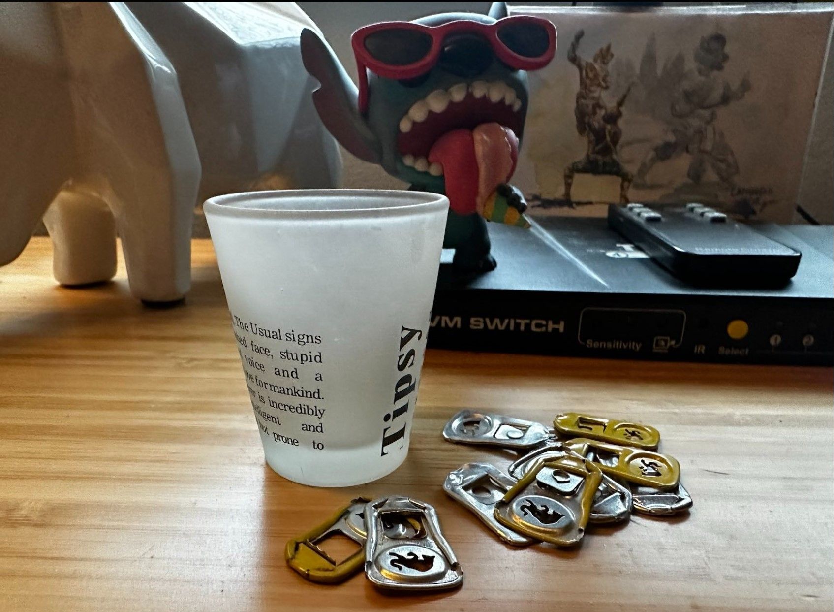 Redbull pull tabs and the shot glass are part of my productivity stack.